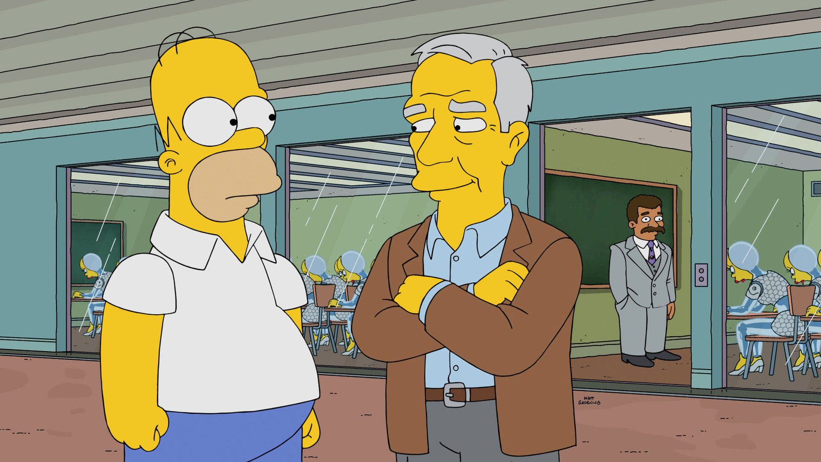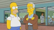 Homer AcademyVoller Stolz erhält Homer (l.) die Möglichkeit, mit den besten Professoren Amerikas Roboter zu unterrichten. Unter ihnen ist auch der amerikanische Schriftsteller und Professor Robert McKee (r.).Bild: © ORF eins