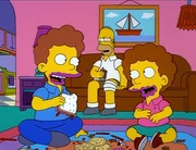 Die unheimlich verteufelte Zeitreise durch das schwarze LochBart (M.r.) reist ins Jahr 1974, wo er ein heutzutage seltenes Comicheft zum Coverpreis kauft, aber gleichzeitig dafür sorgt, dass Marge nicht mit Homer (hinten), sondern mit Artie Ziff (M.l.) anbandelt ...Bild: © ProSieben Media AG © 2012-2013 Fox and its related entities. All rights reserved