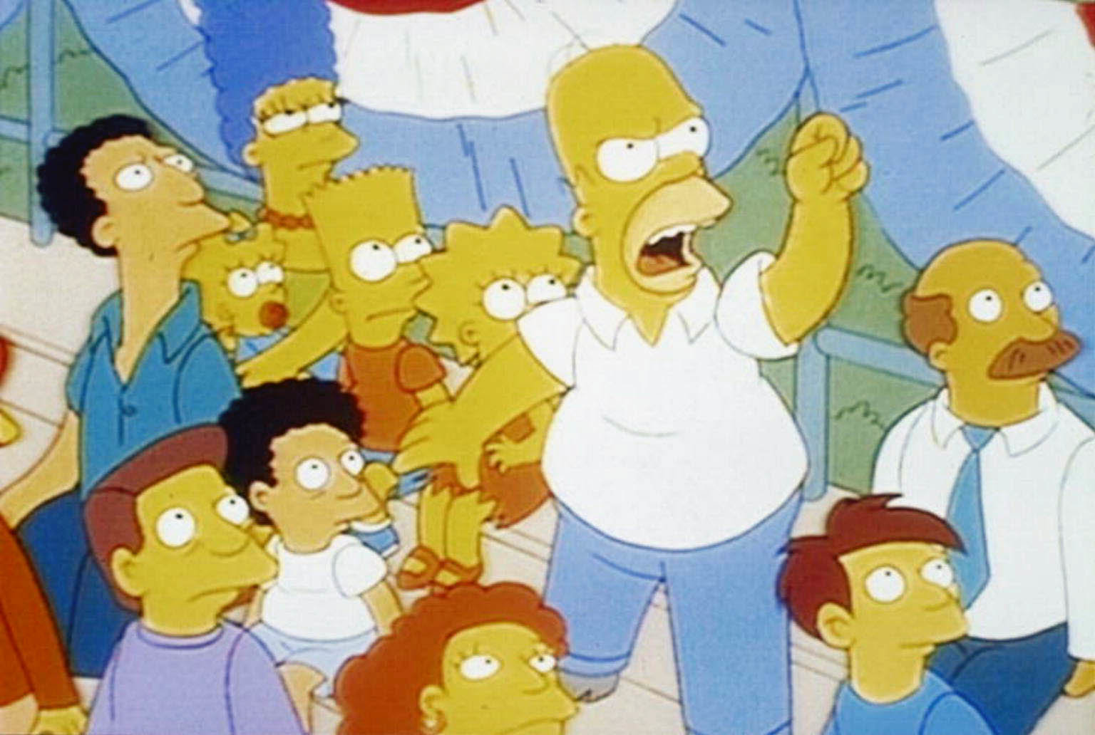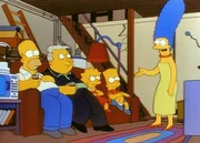 Der Mann im blauen FlanellErschreckt sehen die Simpsons und die anderen Zuschauer den Schwerverbrecher Tingeltangel-Bob auf dem Großbildschirm des Stützpunktes.Bild: © PR7; ProSieben Media AG