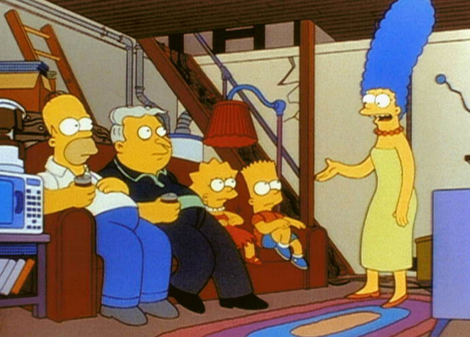 Der perfekte SturmMarge (re.) findet Homer (li.), Larry, Lisa und Bart (2.v.re.) im Keller versteckt.Bild: © PR7; ProSieben Media AG