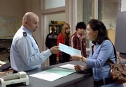 Das Geschenk15 Uhr im Ersten. Julia (Gaia Vogel, im HG l.) und Pablo (Seckin Orhan, im HG r..) sind bei ihrer Flucht von der Polizei aufgegriffen worden. Katja (Julia Stemberger, r.) bittet den Polizisten (Peter Gulan, l.) um Verständnis für das unglückliche Liebespaar.Bild: © einsfestival