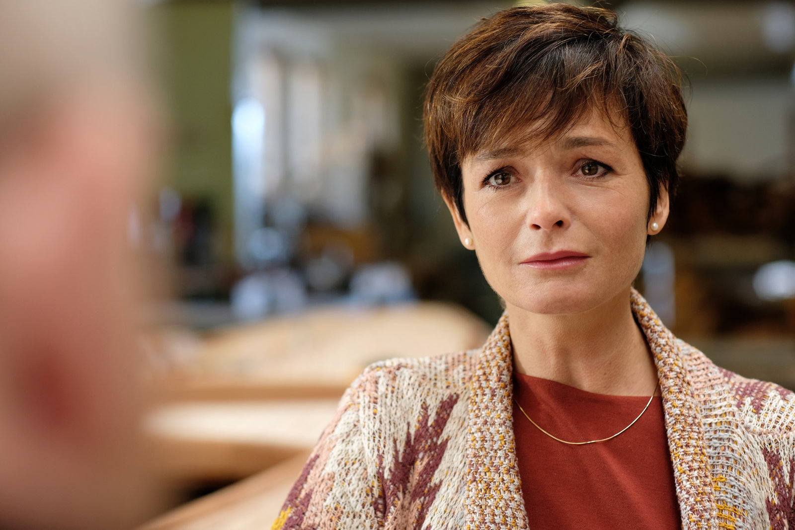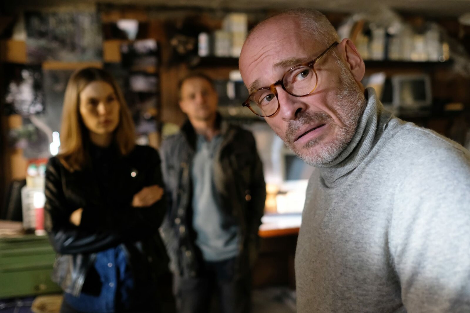 Der SeelenkreisHannah Zeiler (Nora Waldstätten, r.) und Micha Oberländer (Matthias Koeberlin, l.) befragen Thea Köck (Loretta Pflaum, M.) zum Lagerbestand.Bild: © ORF/Graf Film/Patrick Pfeiffer