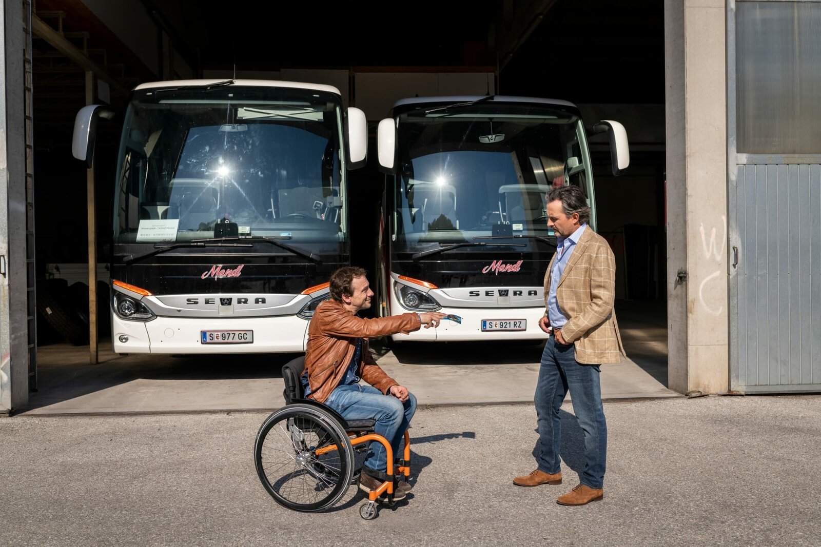 Peter Palfinger (Florian Teichtmeister, l.) besucht Rudi Mandl (Harald Schrott, r.) auf dem Firmengelände und befragt ihn zu dem Lederkoffer.