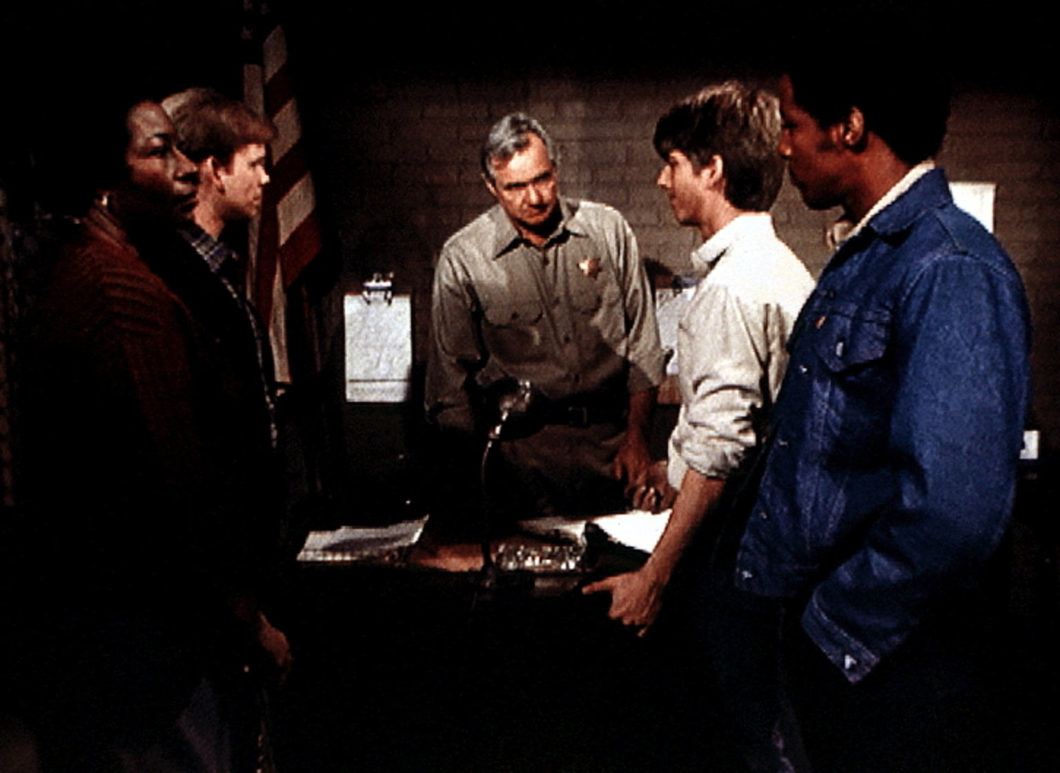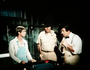 Geliebte FreiheitVerdie (Lynn Hamilton, l.) und Jason (Jon Walmsley, 2.v.l.) holen Jim Bob (David W. Harper, 2.v.r.) und Jody (Charles R. Penland) aus dem Gefängnis ab. Die beiden waren wegen groben Unfugs von Sheriff Walt (John Carter) festgenommen worden.Bild: © WARNER BROS. INTERNATIONAL TELEVISION Lizenzbild frei