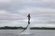 Übers Wasser laufenDie Jungs-WG: Abenteuer Amsterdam. Ein Vogel? Ein Flugzeug? Supermann? Nein, es ist Mark! Und obwohl er zum ersten Mal auf Water Jets steht, kann er sich lange schwebend über Wasser halten.Bild: © KiKA/Wessel de Groot
