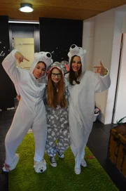 Folge 18Lilly (l.), Farina (M.) und Clara (r.) haben eine Wette verloren und müssen Eisbär- und Hasen-Kostüme tragen.Bild: © ZDF und Jona Stracke.