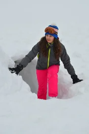 Folge 7Leona steigt aus dem selbstgebauten Iglu.Bild: © ZDF und Jonas Stracke