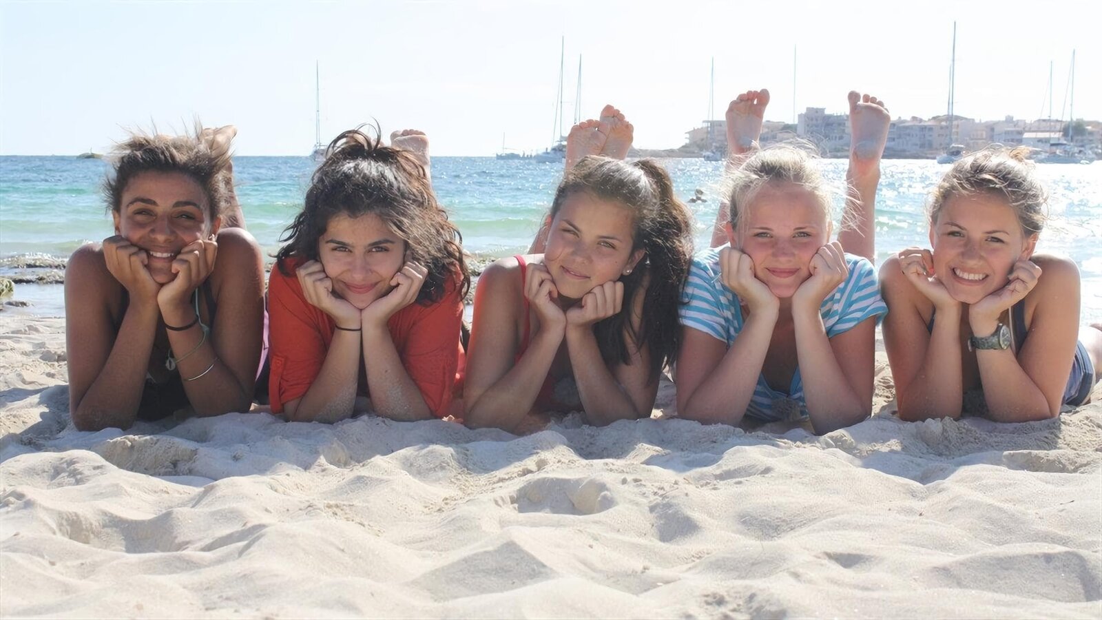 Folge 7Die Mädchen-WG - Urlaub ohne Eltern: V.l.: Bianca, Buse, Louisa, Maja, Weya genießen das Strandleben.Bild: © ZDF/Chakki Chung