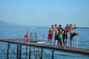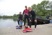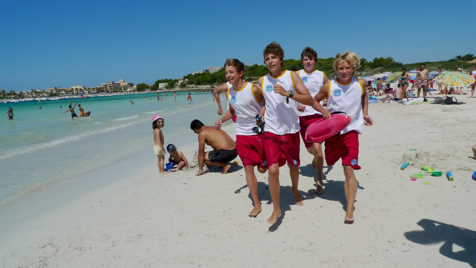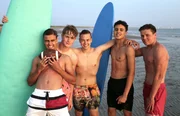 Profitraining im FußballcampDie Jungs-WG: Charlie, Jonas, Danny und Alex (v.l.n.r.) unterstützen die Rettungsschwimmer vom Roten Kreuz.Bild: © ZDF/Tobias Zydra