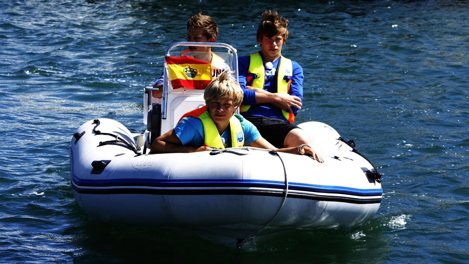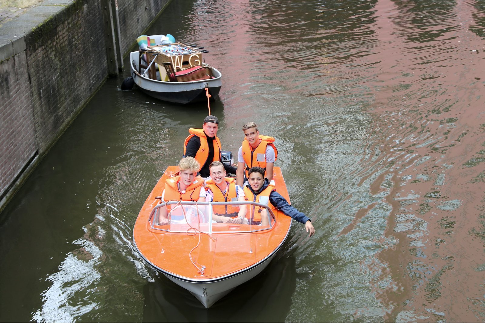 ToleranzDie Jungs-WG: Abenteuer Amsterdam. Mark, Jeppe, Alex, Luke und Ruben schleppen mit dem WG-Motorboot ein voll beladenes Boot in die Amsterdamer Innenstadt.Bild: © KiKA/Wessel de Groot