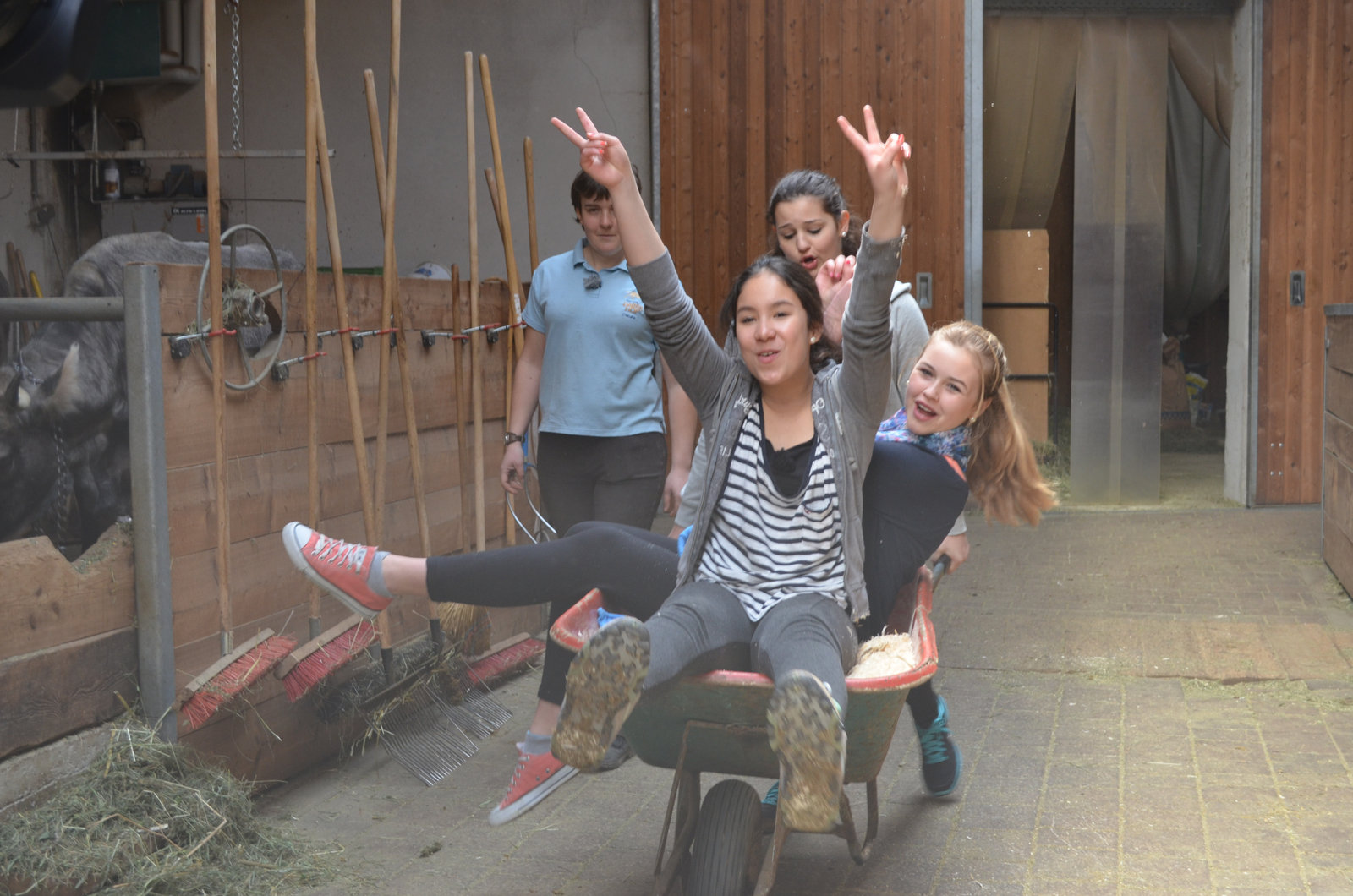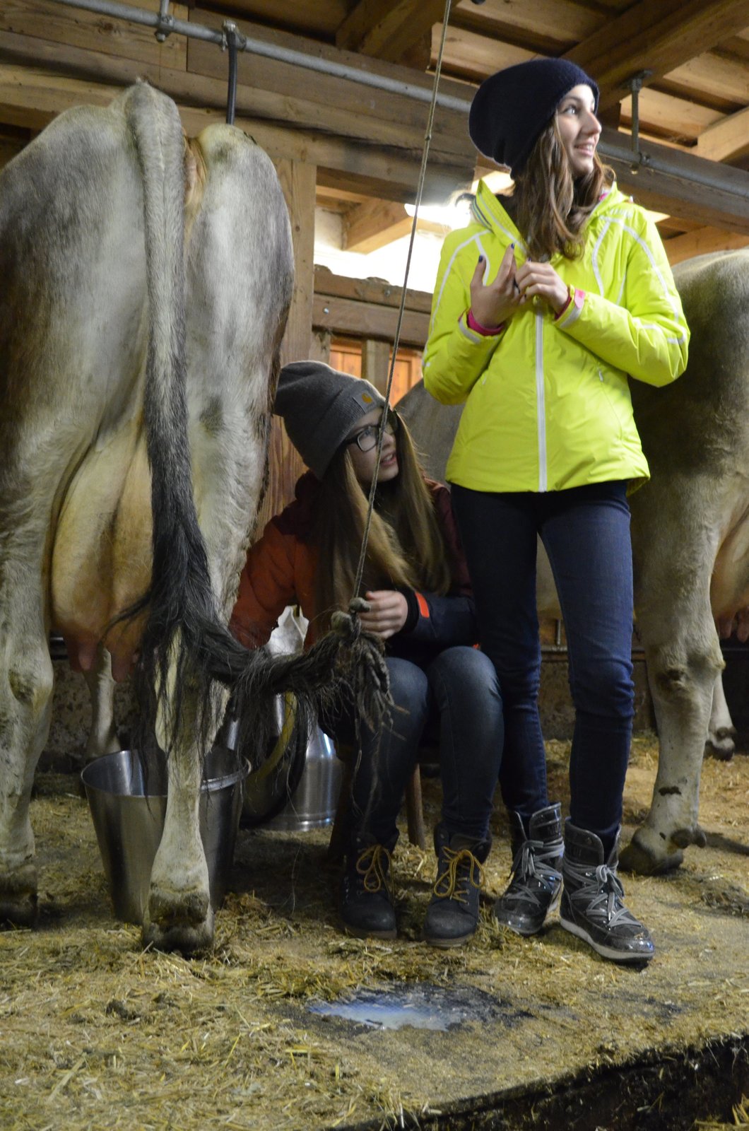 Folge 11Die Mädchen-WG: Ohne Eltern in den Schnee. Farina (l.) und Clara (r.) lernen Melken.Bild: © ZDF und Jonas Stracke.