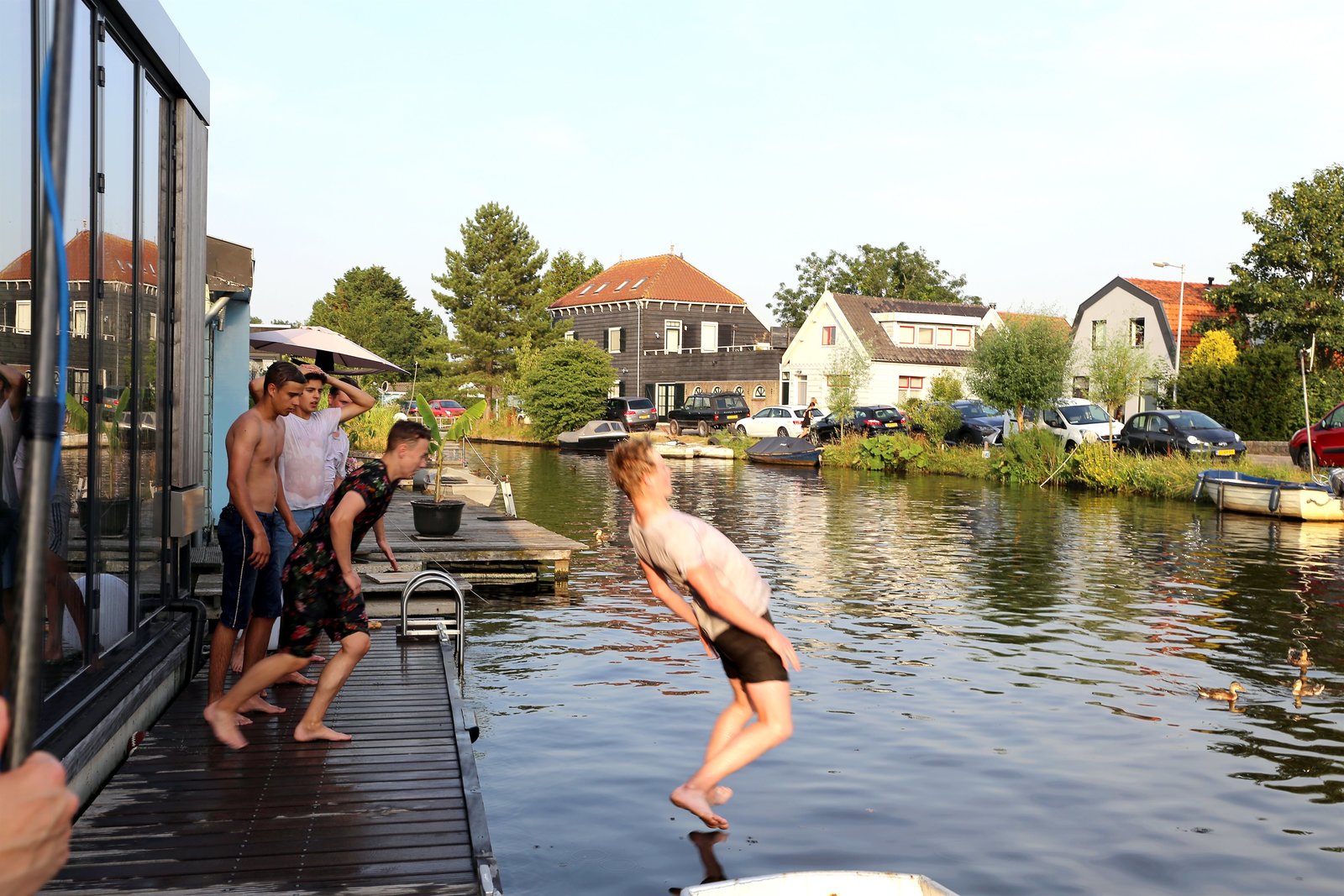 Hier stinkt's!Abkühlung vor der Hausboot-Haustür! Mark macht den Anfang und Luke, Ruben, Jeppe und Alex folgen ihrem Mitbewohner mit einem Sprung in die Gracht.Bild: © KiKA/Wessel de Groot