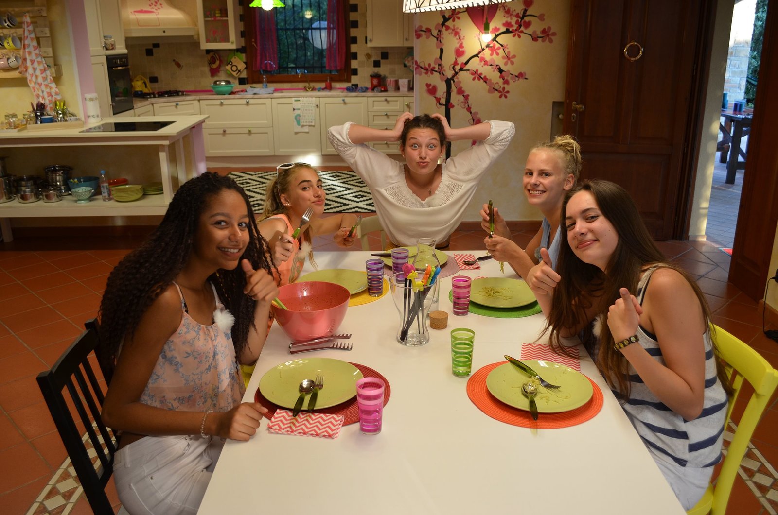 Folge 1Serena, Luna, Natalie, Jolina und Kaya (v.l.n.r.) beim ersten gemeinsamen Abendessen in der Villa.Bild: © ZDF/Jonas Stracke