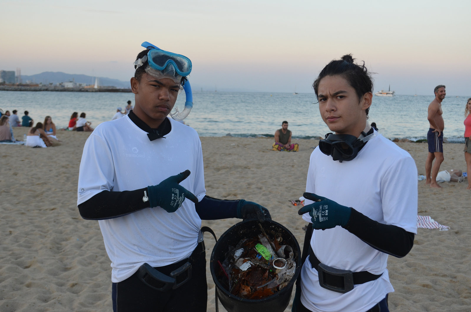 Folge 9Chinedu und Timmy sammeln Plastikmüll am Strand.Bild: © ZDF/e+u tv