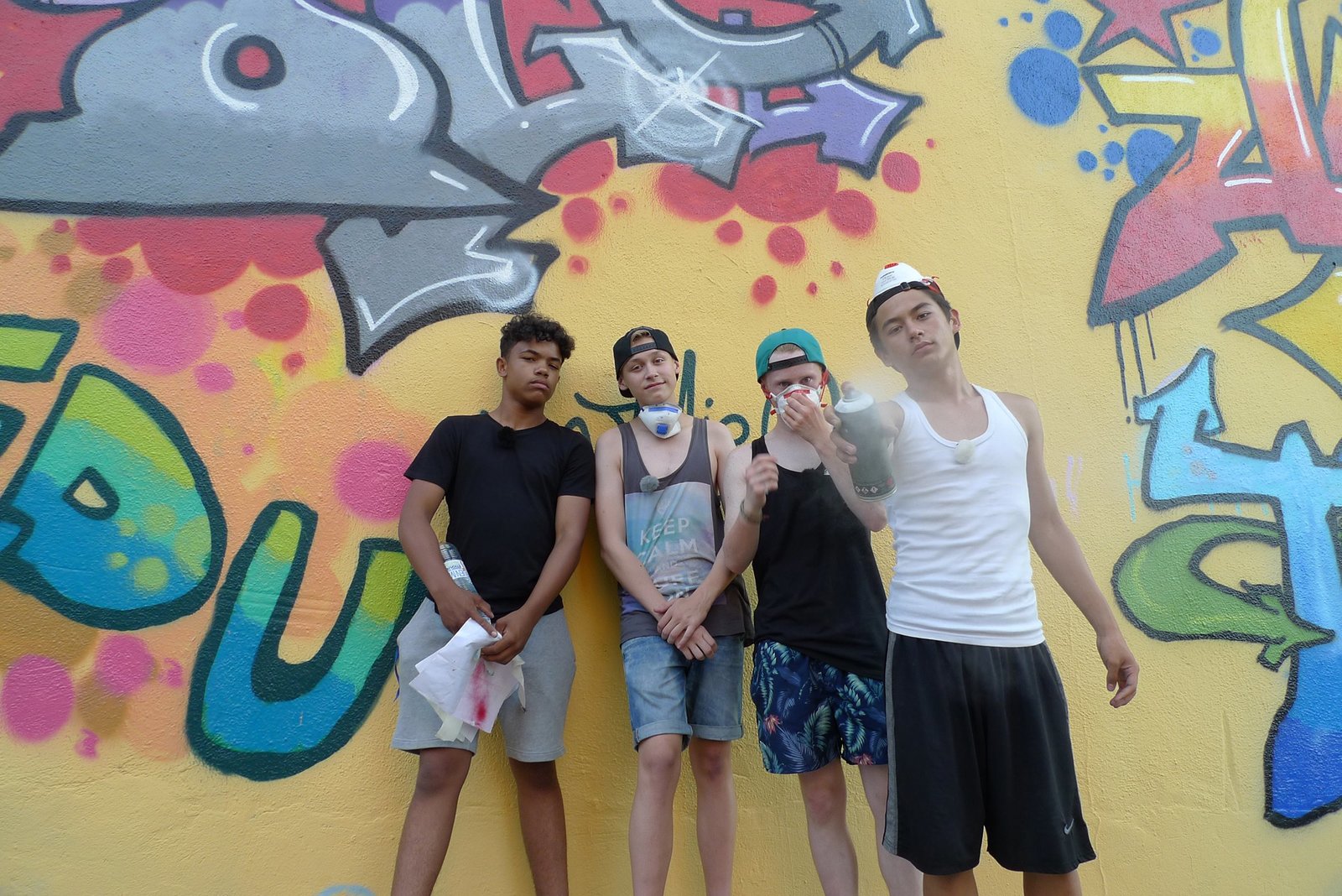 Folge 5Chinedu, Ole, Justus und Timmy posen vor dem WG-Graffiti.Bild: © ZDF/e+u tv