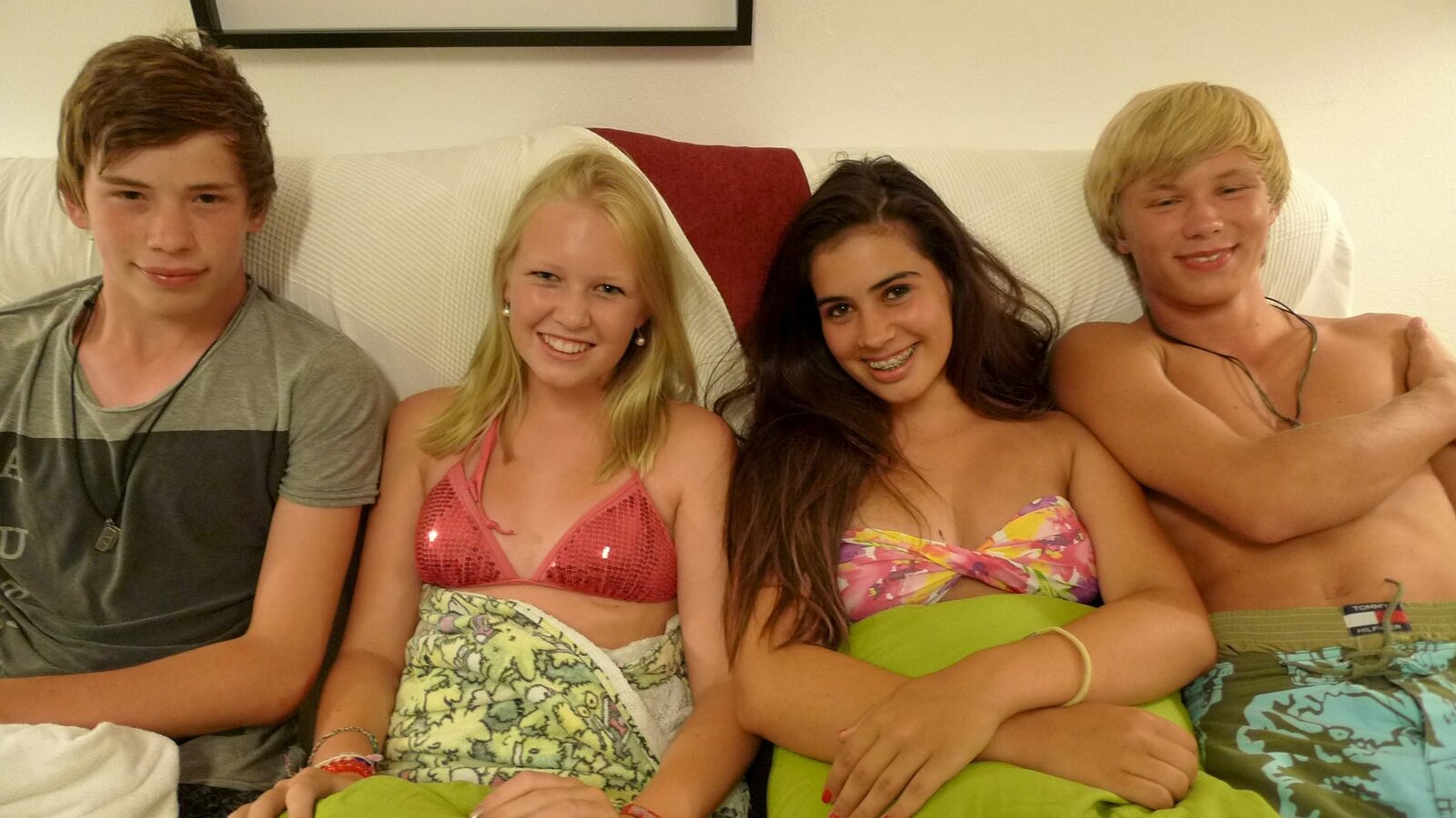 Wie flirtet man richtig?Die Jungs-WG: Danny und Alex (außen) mit ihrem Mädchen-Besuch auf dem Sofa.Bild: © ZDF/Tobias Zydra