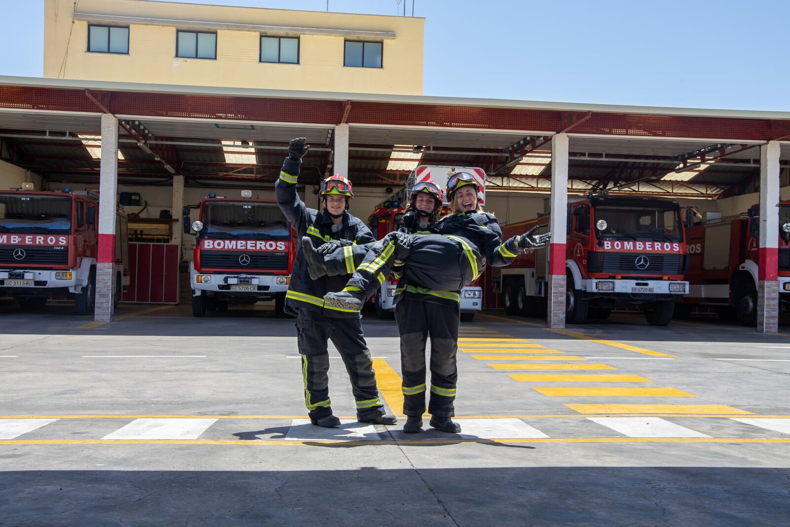 Wasser marsch!Für Jasper, Leo und Lia steht ein Praktikum bei den Bomberos an - der Feuerwehr auf Gran Canaria. In dicken Feuerwehranzügen lernen die drei was man bei einem Einsatz tun muss und wie man ein Feuer löscht.Bild: © ZDF/Georg Bussek