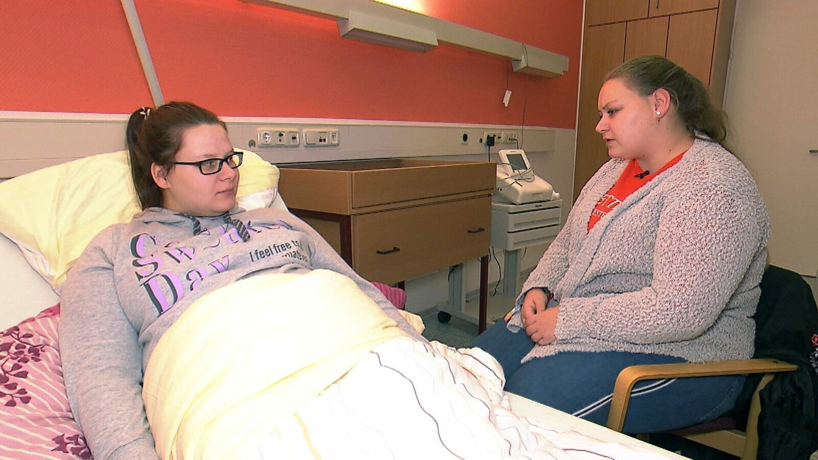 Die Wollnys zwischen Schockstarre und Charity-EventDie schwangere Calantha liegt nach starken Bauchschmerzen im Krankenhaus und bekommt Besuch von ihrer älteren Schwester Sarah-Jane, die sich um sie kümmern möchte.Die schwangere Calantha liegt nach starken Bauchschmerzen im Krankenhaus und bekommt Besuch von ihrer älteren Schwester Sarah-Jane, die sich um sie kümmern möchte.Bild: © RTL Zwei
