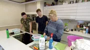 Silvia bittet die Jungs zum HaushaltskursSilvia bringt Peter (Mitte) und Flo das große Putz-und-Wasch-Einmaleins bei..Bild: © RTL Zwei