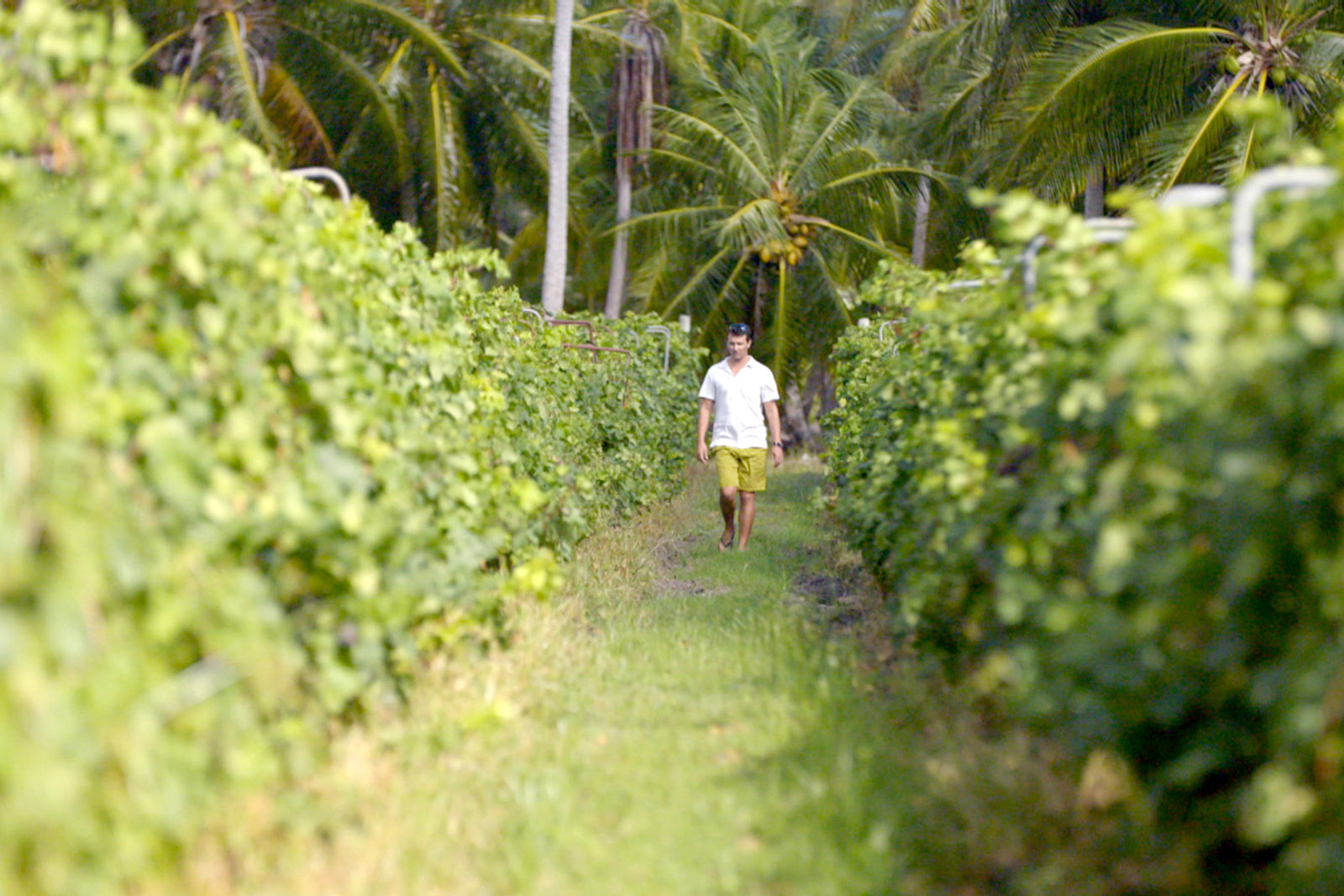 Polynesien: Weinanbau mitten im PazifikDer französische Önologe Sébastien Thépenier begutachtet die Weinreben der einzigen Weinplantage der Tropen: Auf dem Atoll von Rangiroa im Tuamotu-Archipel behauptet sich inmitten der tropischen Vegetation ein Areal mit Reben.Bild: © ARTE France