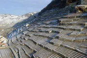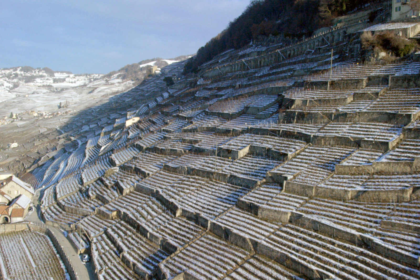 Schweiz - Die Weinterrassen von LavauxLuftsicht auf die schneebedeckten Weinterrassen von Lavaux am Ufer des Genfer SeesBild: © ARTE France Honorarfreie Verwendung nur im Zusammenhang mit genannter Sendung und bei folgender Nennung "Bild: Sendeanstalt/Copyright". Andere Verwendungen nur nach vorheriger Absprache: ARTE-Bildreda
