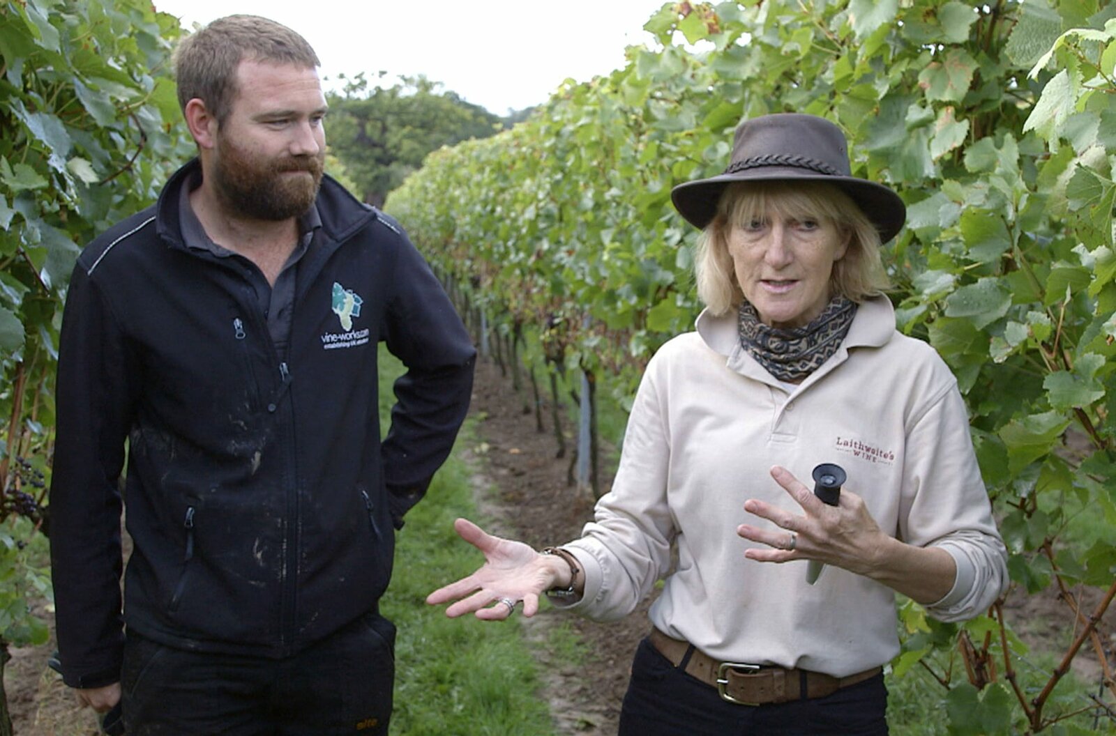 England - Ein königlicher SektAnne Linder mit einem Kollegen in den Weinreben im Park des Schlosses Windsor. Sie erklärt, dass sie wegen des wechselhaften Wetters die Reben täglich kontrollieren muss.Bild: © Grand Angle Productions / © Grand Angle Productions