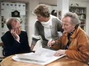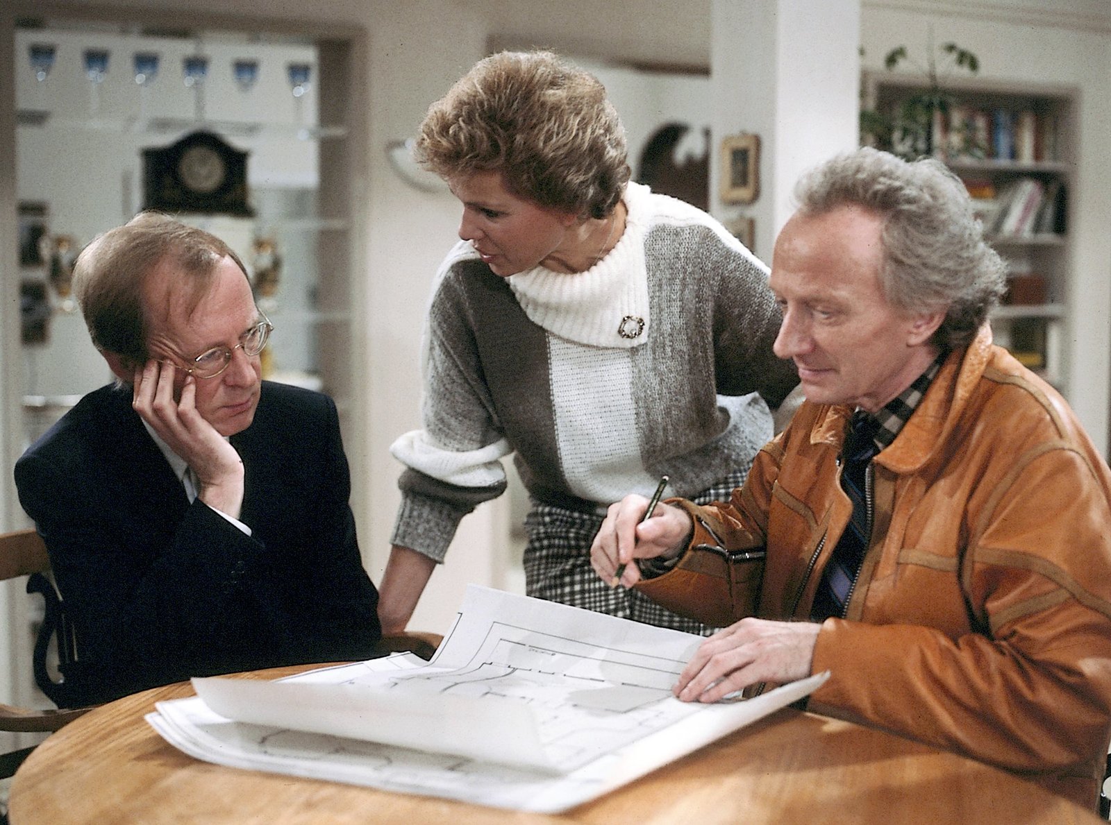 Das kalkulierbare Risikohr-fernsehen DIESE DROMBUSCHS (7), Das kalkulierbare Risiko, Zwölfteilige Fernsehserie, Deutschland 1982 - 1983, am Montag (23.06.14) um 22:35 Uhr. Die Pläne für das neue Haus werden von Siegfried (Hans-Peter Korff, links) und Vera Drombusch (Witta Pohl) unterschiedlich beurteilt - entsprechend der unterschiedlichen Interessenlage. Rechts: Balduin Baas als Herr Kreutzer.Bild: © HR/ZDF und Gyula Trebitsch Prod. GmbH