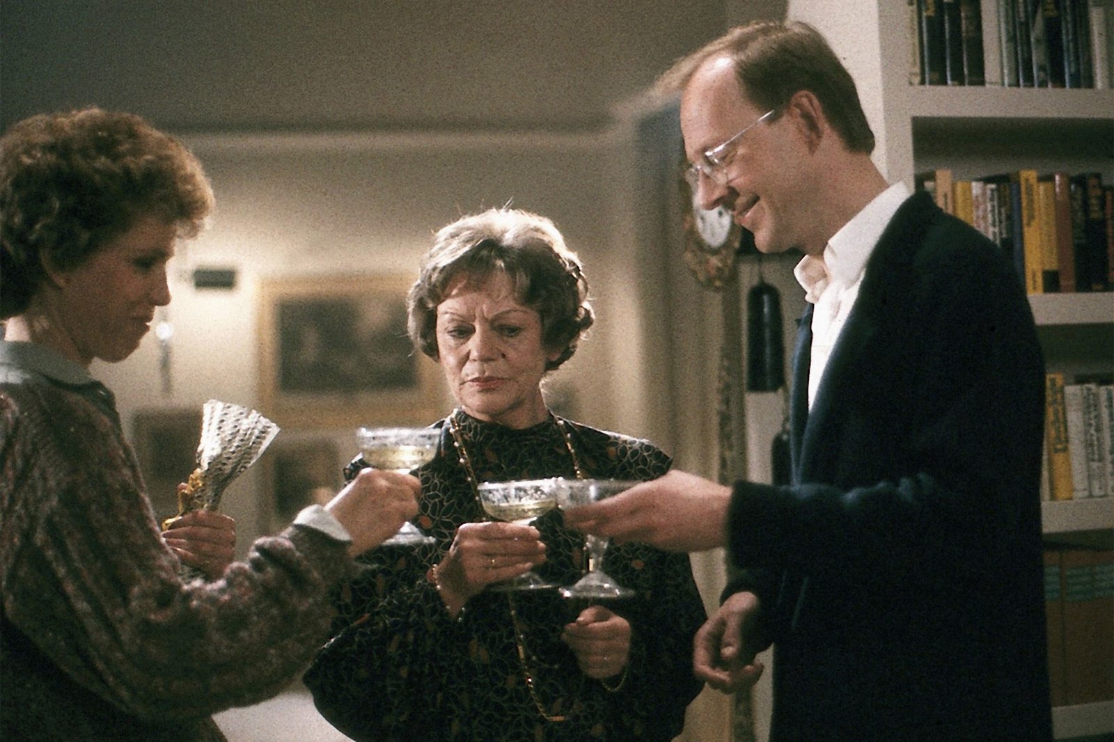 Alle Jahre wiederhr-fernsehen DIESE DROMBUSCHS (1), Alle Jahre wieder, Zwölfteilige Fernsehserie, Deutschland 1982 - 1983, am Montag (28.04.14) um 20:15 Uhr. Die Familie Drombusch beschließt, das verkorkste Weihnachtsfest mit einer stimmungsvollen Neujahrsnacht wieder gutzumachen (von links): Vera Drombusch (Witta Pohl), Margarete Drombusch (Grete Wurm) und Siegfried „Sigi“ Drombusch (Hans-Peter Korff).Bild: © HR/ZDF und Gyula Trebitsch Prod. GmbH