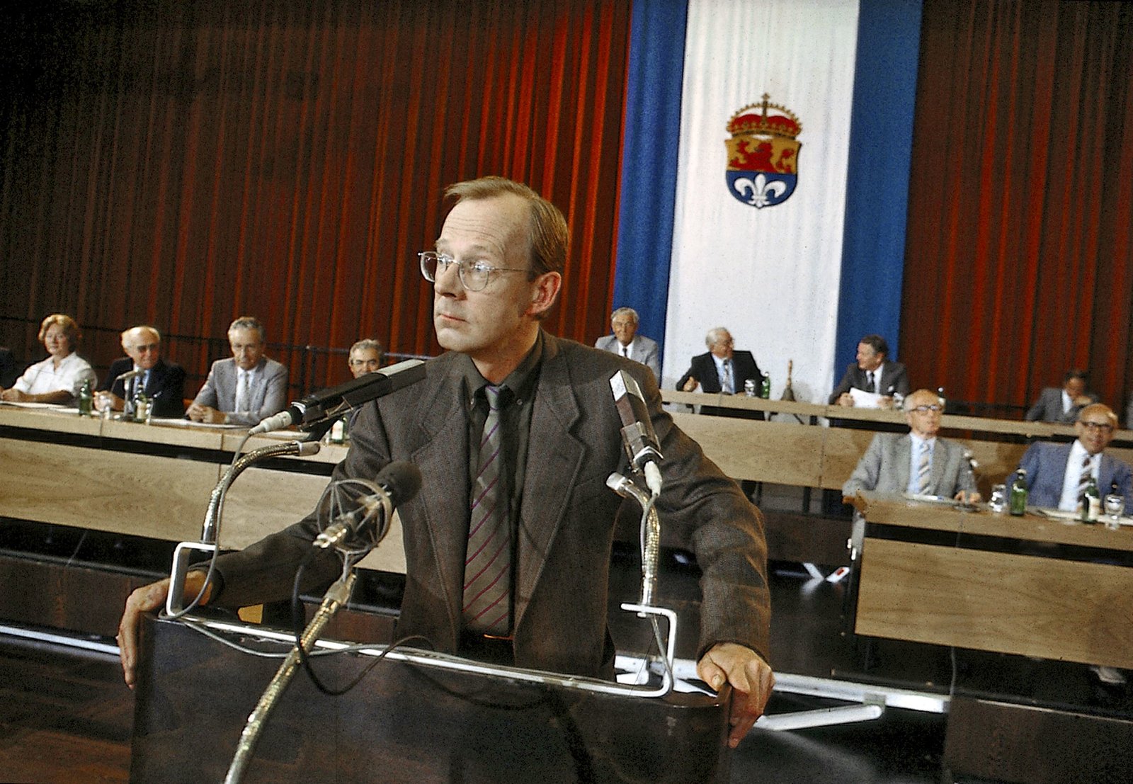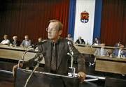 Der Appellhr-fernsehen DIESE DROMBUSCHS (2), Der Appell, Zwölfteilige Fernsehserie, Deutschland 1982 - 1983, am Montag (05.05.14) um 20:15 Uhr. Siegfried Drombusch (Hans-Peter Korff) hält vor dem Plenum der Stadtverordnetenversammlung eine Rede.Bild: © HR/ZDF und Gyula Trebitsch Prod. GmbH