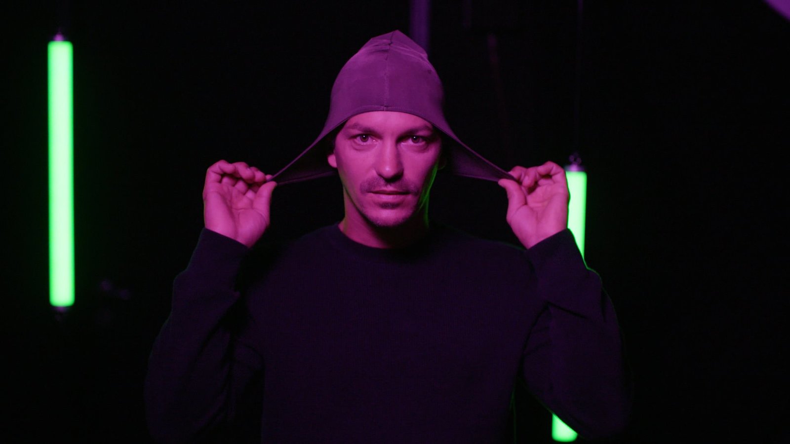 Faris Rahoma mit einer 'Schutzkappe für den Geist', eine 'strahlenabschirmende, silberüberzogene Stoffkappe gegen Elektrosmog, Chemtrails und Bewusstseinskontrolle'. Originalobjekt, bestellt in einem Onlineshop, Nylonstoff, € 55,-Bild: © ORF / Golden Girls Filmproduction
