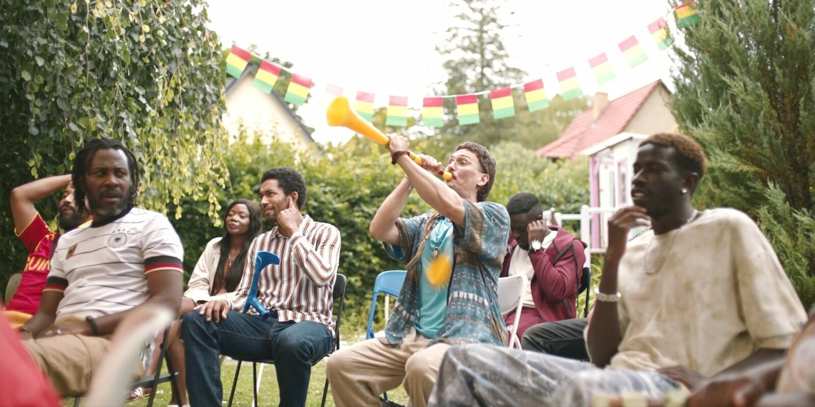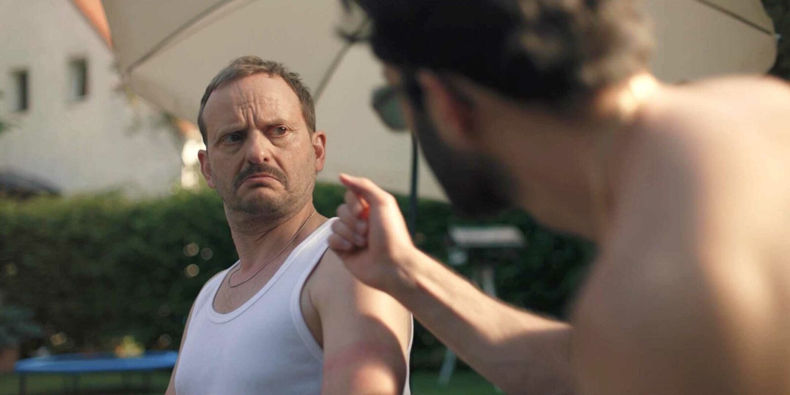 VorrundenausAndi (Milan Peschel) missfällt, dass er beim Public Viewing in Theos Garten fast der einzige Weiße ist.Bild: © ZDF und Max Preiss.