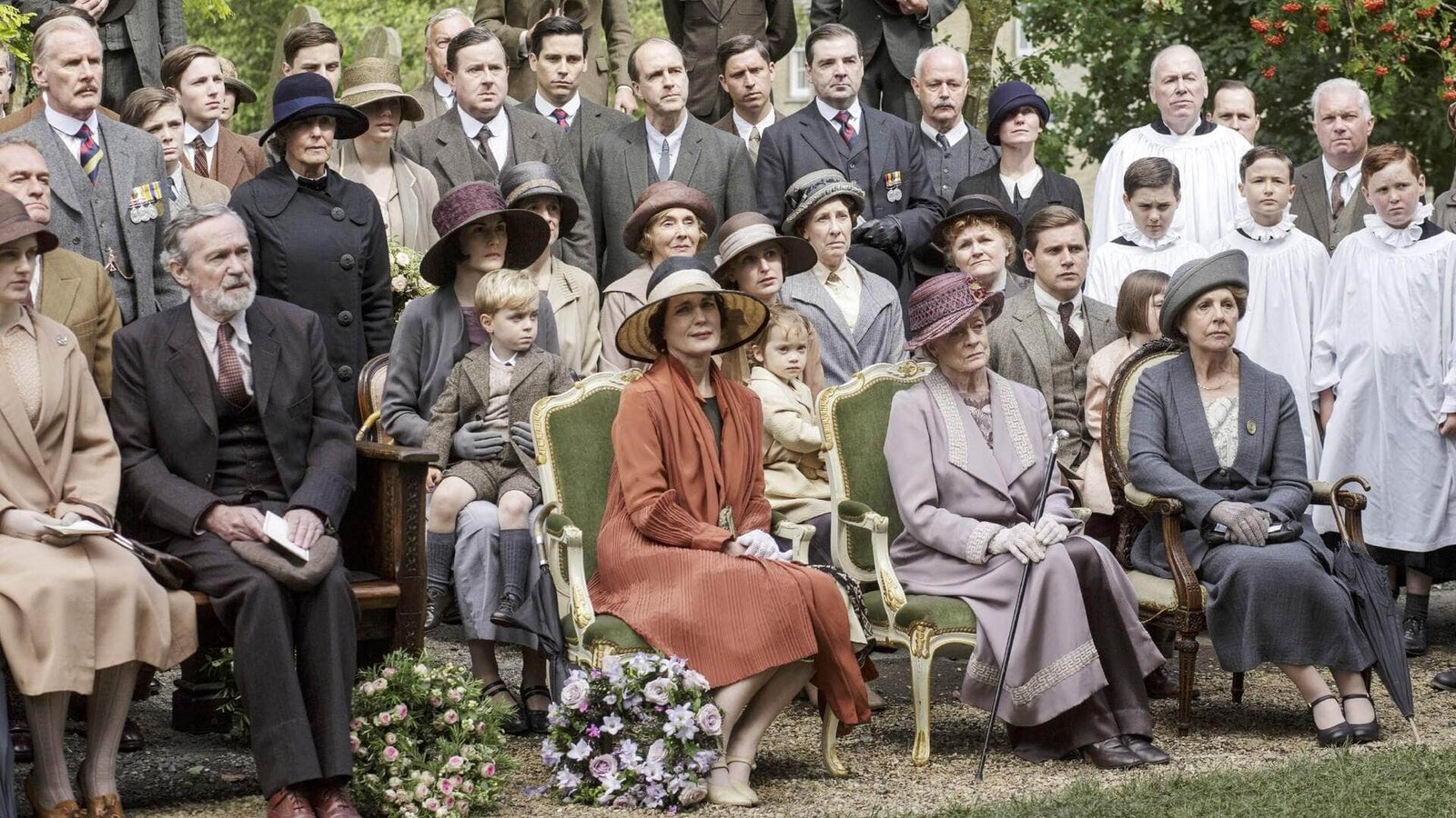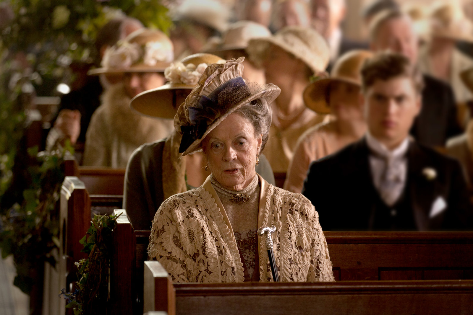ScherbenhaufenDowager Countess Lady Violet Crawley (Maggie Smith, vorne) als Gast der Hochzeit von Enkelin Edith. (Andere Darsteller nicht bekannt.)Bild: © ZDF und NBC Universal