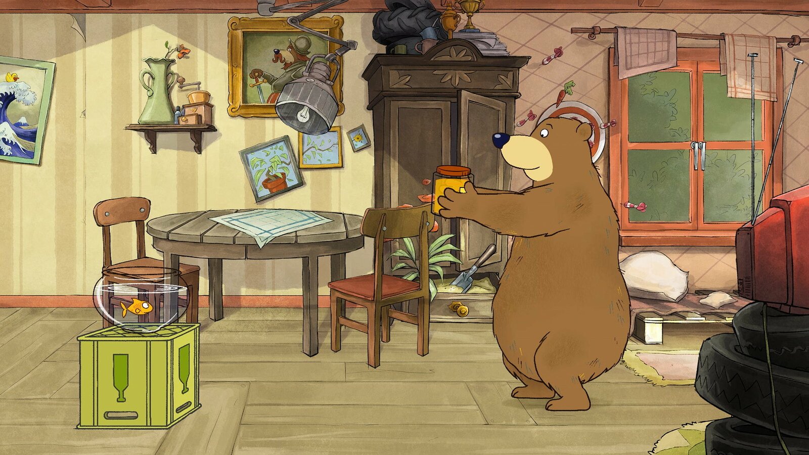 Dr. Brumm macht SportDr. Brumm schnappt sich sein Honigglas für weitere Sportübungen: mit ein paar Kniebeugen fängt er an.Bild: © rbb/WunderWerk/TRIKK 17