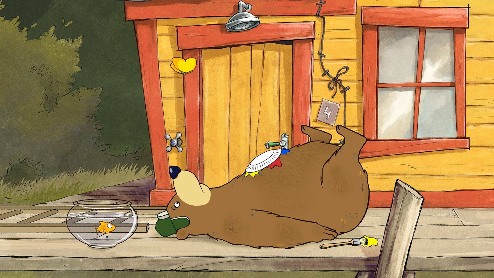 Dr. Brumm malt ein BildDr. Brumm ist samt Farbteller vom Dach geplumpst, weil der Schmetterling, den er malen möchte, immer wieder davonflattert.Bild: © rbb/WunderWerk/TRIKK 17