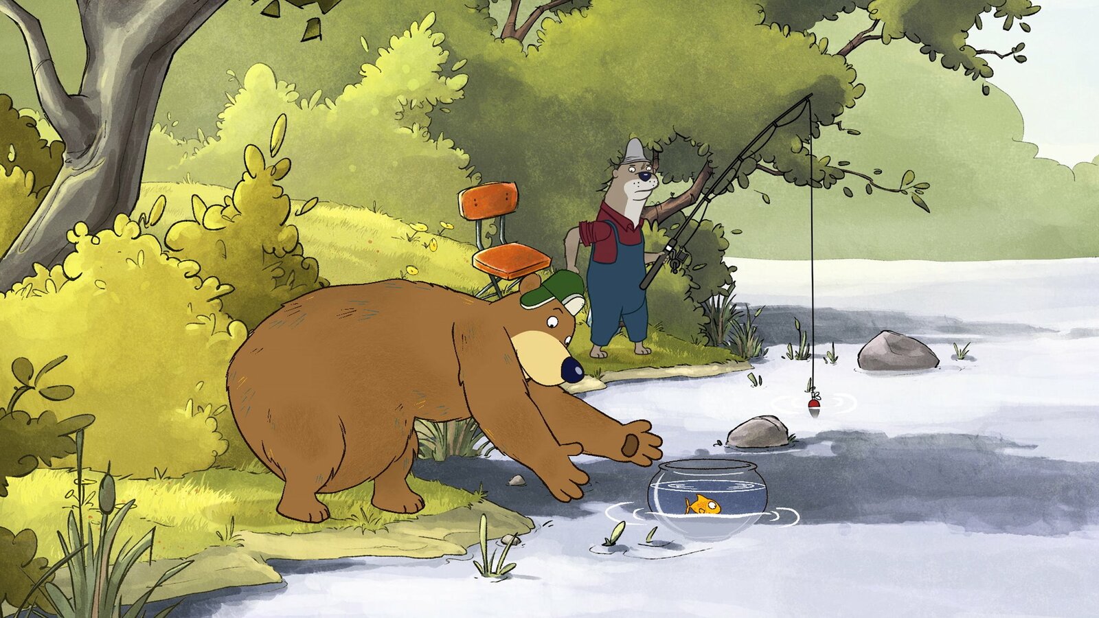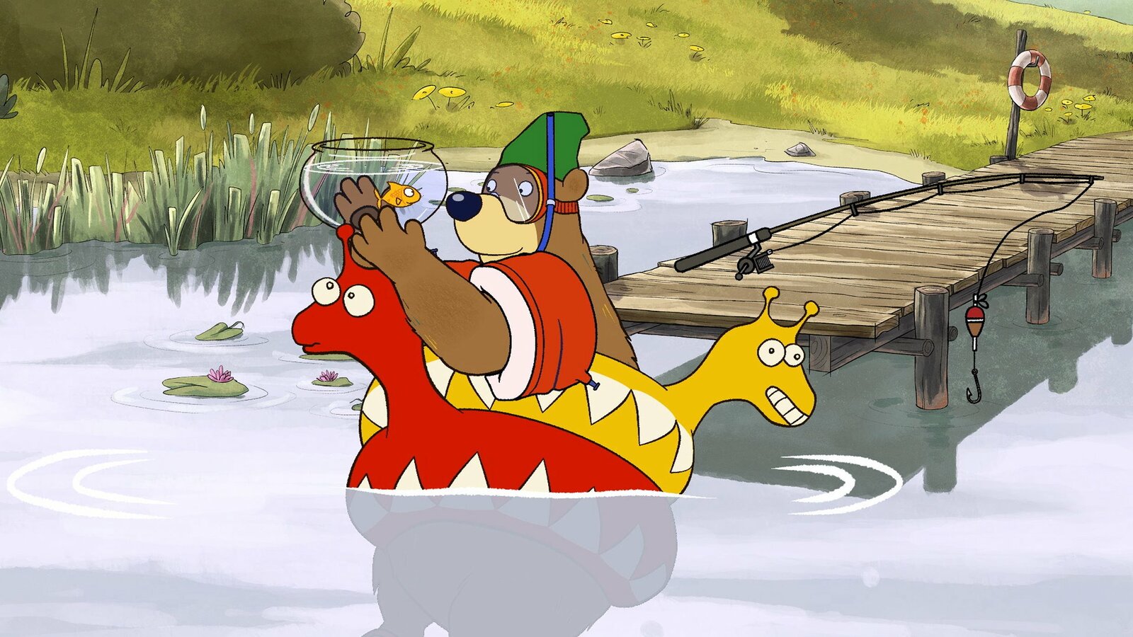 Dr. Brumm geht badenDr. Brumm und Pottwal treffen am See auf Bauer Hackenpiep.Bild: © rbb/WunderWerk/TRIKK 17