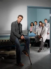 Zu den Sternen?(3. Staffel) - Dr. Gregory House (Hugh Laurie, l.) und sein Team: Dr. Robert Chase (Jesse Spencer, 3.v.l.), Dr. Lisa Cuddy (Lisa Edelstein, 2.v.l.), Dr. Allison Cameron (Jennifer Morrison, 3.v.r.), Dr. Eric Foreman (Omar Epps, 2.v.r.) und Dr. James Wilson (Robert Sean Leonard, r.)Bild: © ProSieben Media AG © 2006 Fox Broadcasting Co.