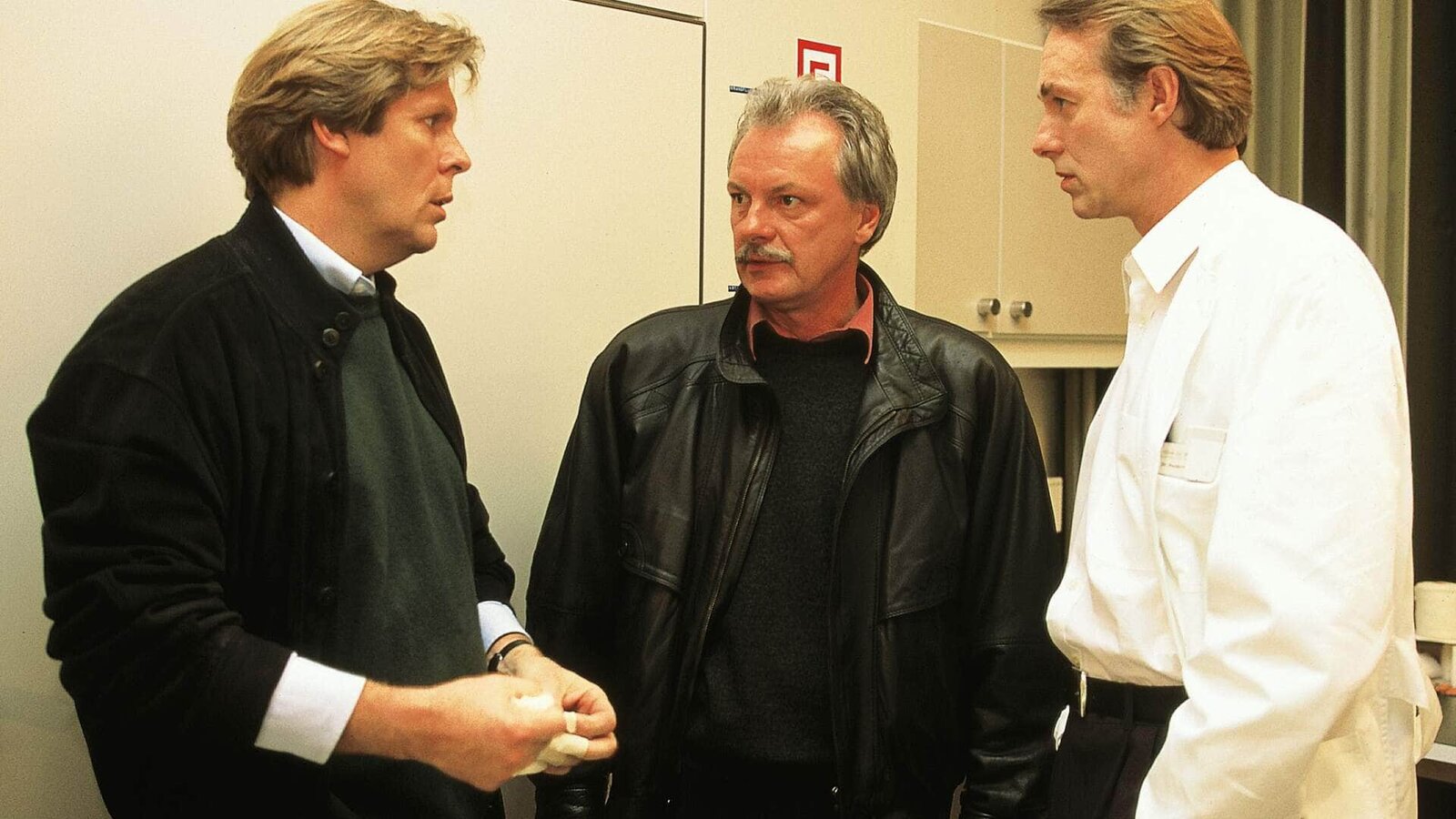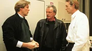 Alarm im OPDr. Stefan Frank (Sigmar Solbach, l.) bespricht mit Kommissar Lüder (Peter Hart, M.) und Dr. Christian Roehrs (Siemen Rühaak) den Zustand von Bachmann.Bild: © MG RTL D / Elke Werner