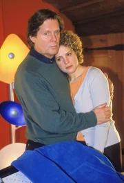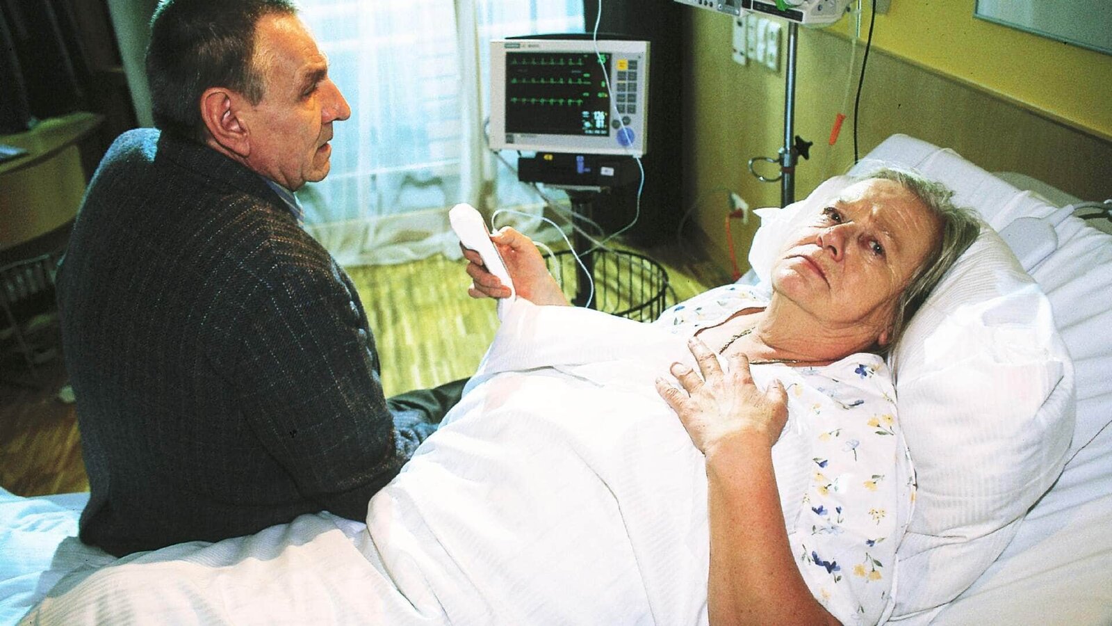 Mit dem Herzen eines VatersHeinz-Georg Harms (Silvester Berger) sitzt am Bett seiner schwer kranken Frau Elisabeth (Gudrun Okras). Sie hat Lungenkrebs. Sie glaubt nicht mehr an Heilung und bittet Dr. Stefan Frank um einen würdevollen Tod.Bild: © MG RTL D / Elke Werner