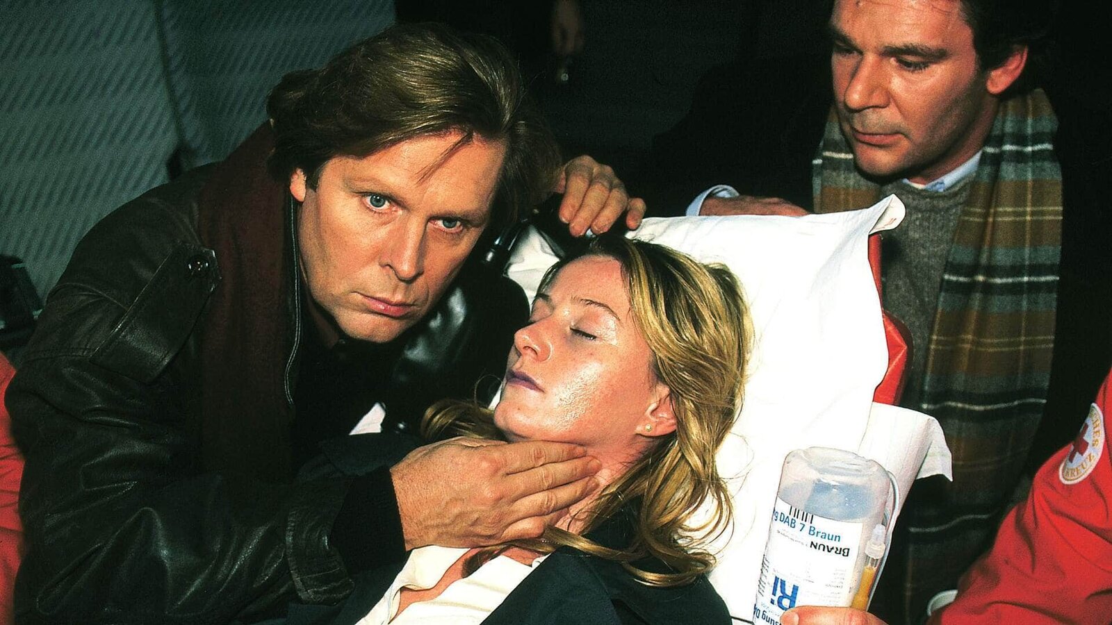 Labyrinth der GefühleDr. Stefan Frank (Sigmar Solbach) wird von Lutz (Peter von Strombeck, r.) gerufen, als seine Freundin Conny Bachmann (Gabriela Benesch) erneut einen Erstickungsanfall erleidet.Bild: © MG RTL D / Elke Werner