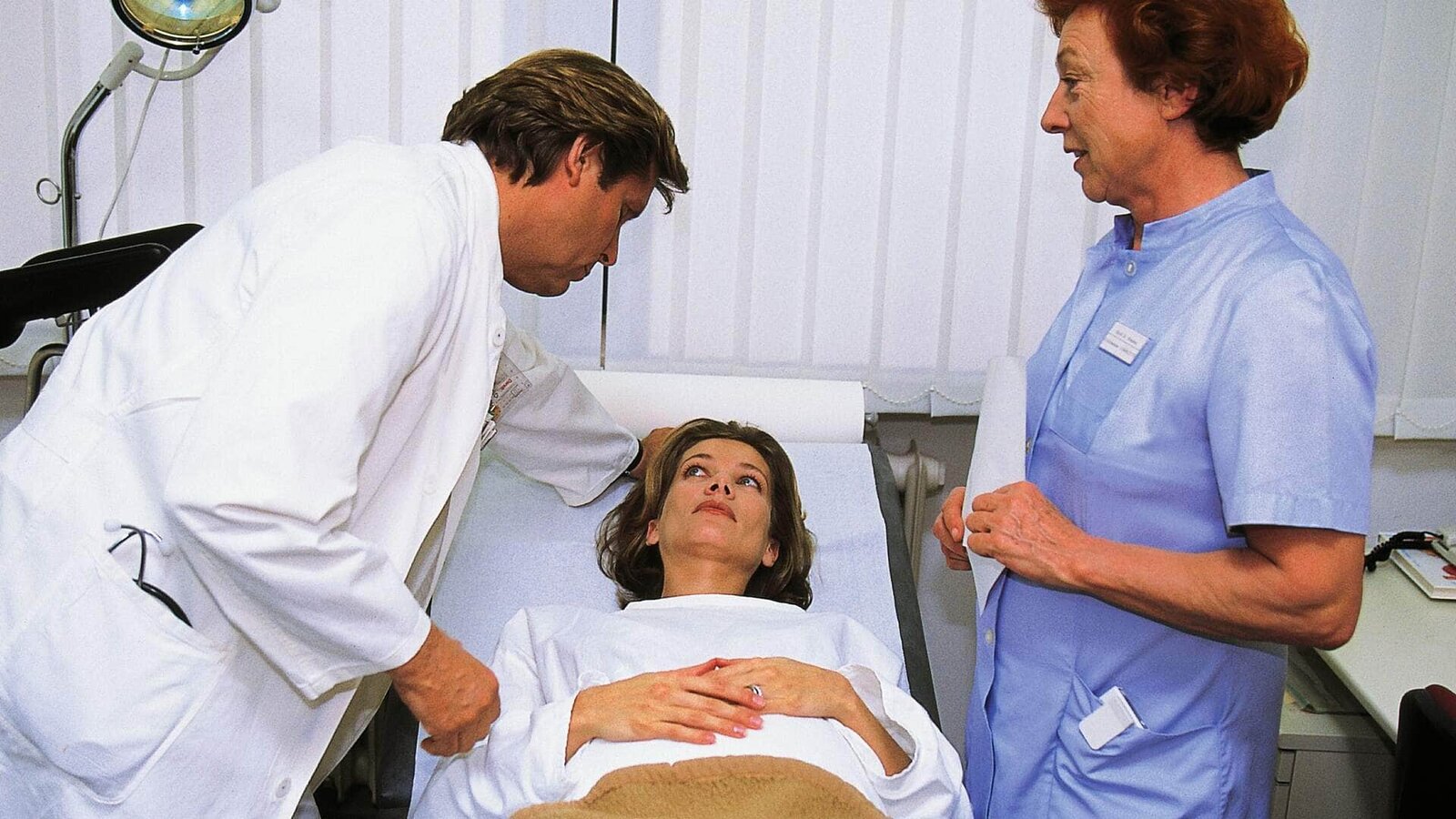 SchweigepflichtDr. Stefan Frank (Sigmar Solbach) hat seine hochschwangere Patientin Patricia Gattinger (Nicole Spieckermann) untersucht. Sie und ihr Mann Bernd freuen sich riesig auf das Baby.Bild: © TVNOW