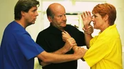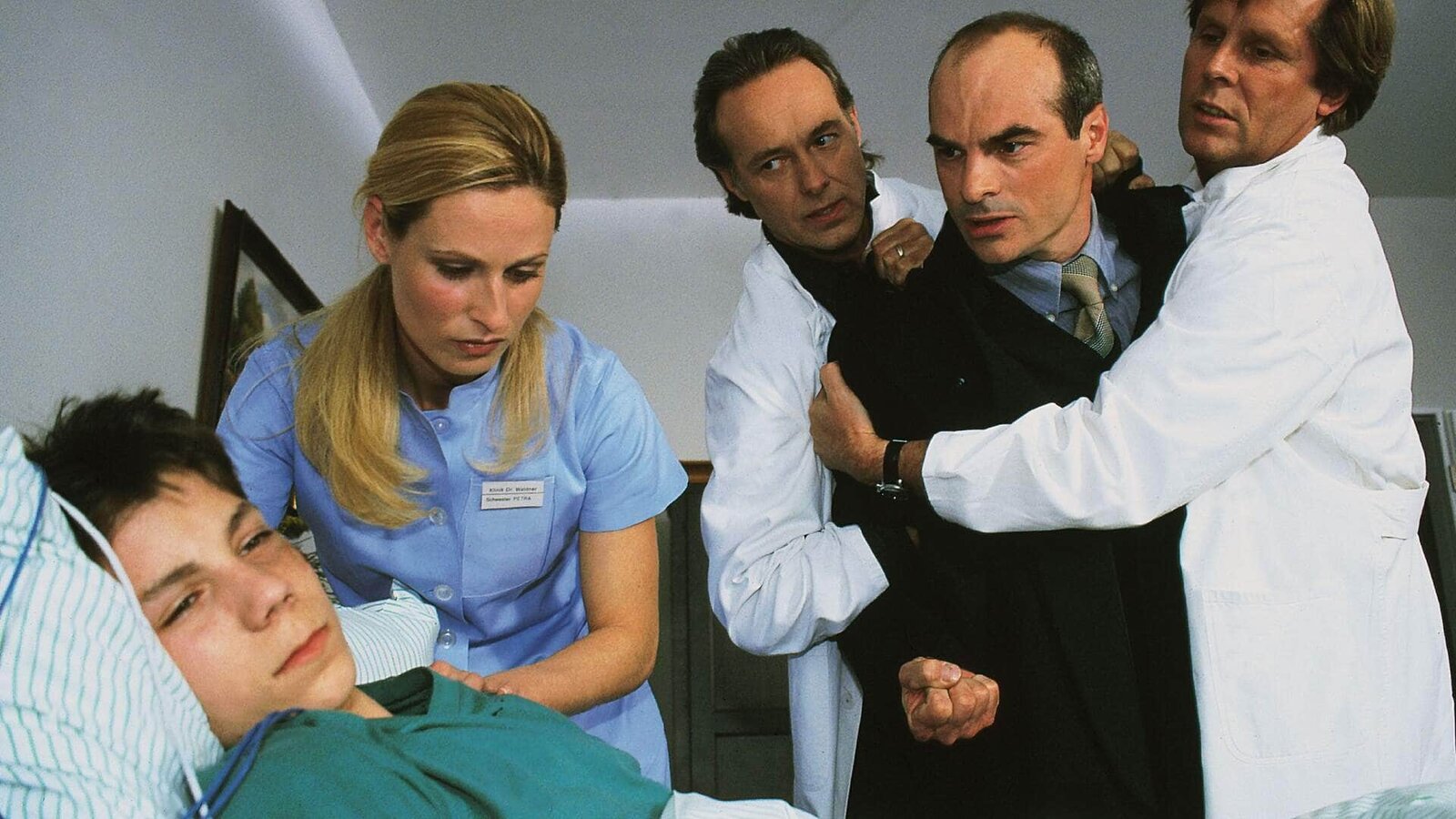 SchlagabtauschDr. Frank (Sigmar Solbach, r.) und Dr. Roehrs (Siemen Rühaak, M.) müssen den gewaltätigen Bernhard (Hans Georg Panczak) sogar am Krankenbett seines Sohnes (Christian Polito) bändigen. Schwester Petra (Annette du Moulin) beruhigt den Jungen.Bild: © MG RTL D / Elke Werner