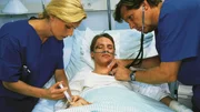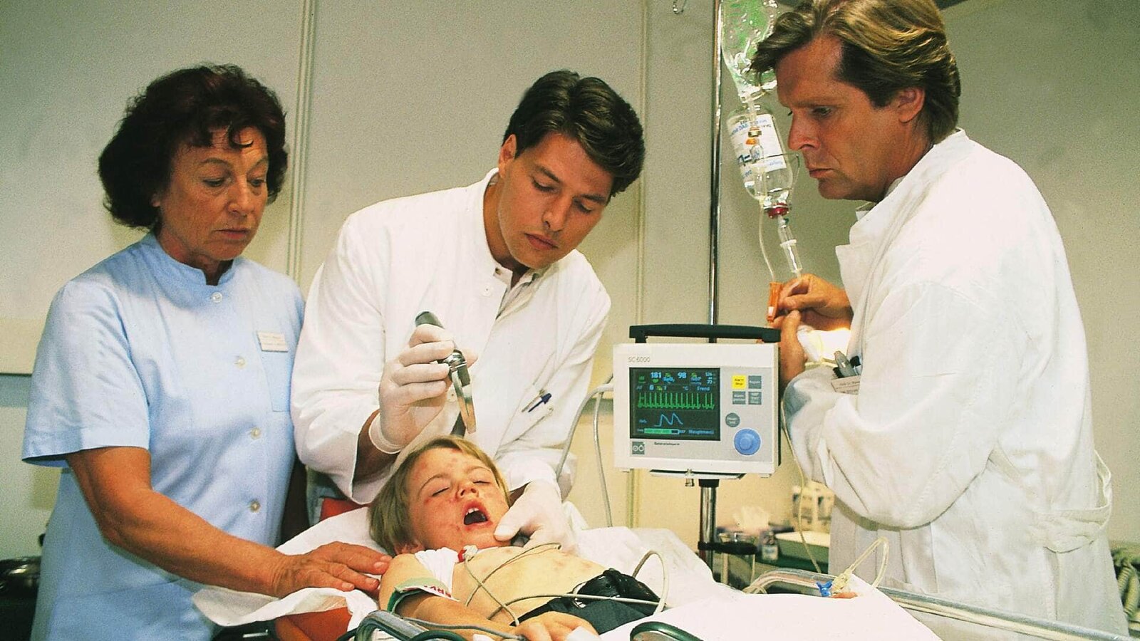 Das Leben geht weiterDr. Stefan Frank (Sigmar Solbach, r.), Dr. Thomas Reinhardt (Christopher Barker) und Oberschwester Charlotte (Barbara Schroth) versorgen den kleinen Sven (Christoph Dirscherl).Bild: © MG RTL D / Elke Werner