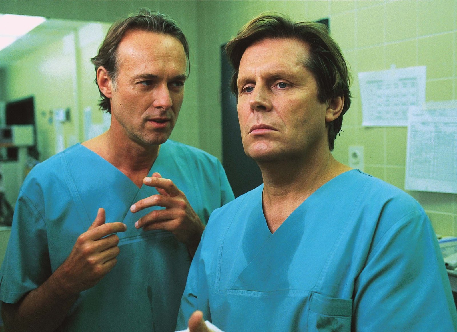 Stunden der AngstDr. Stefan Frank (Sigmar Solbach, li.) und Assistenzarzt Dr. Peter Stein (Zacharias Preen) haben gerade die Schusswunde von Fredi operiert.Bild: © RTLplus