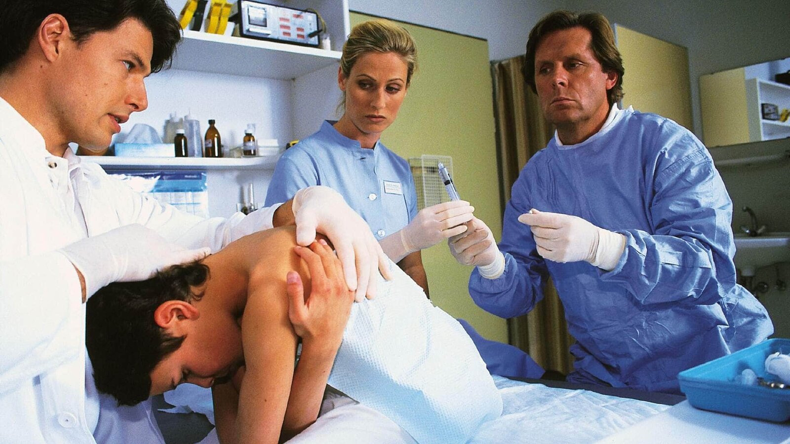 Sei tapfer, ManuelDr. Stefan Frank (Sigmar Solbach, r.) muss Manuel (David Lütgenhorst) punktieren. Dr. Thomas Reinhardt (Christoper Barker, l.) und Schwester Petra (Annette du Moulin) assistieren.Bild: © MG RTL D / Elke Werner