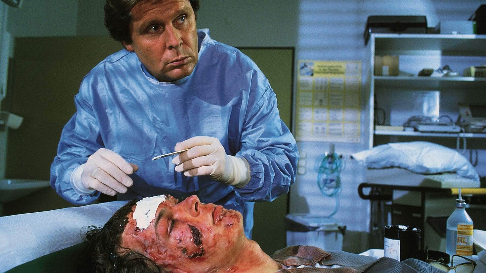 Die GifthöhleDr. Stefan Frank (Sigmar Solbach, oben) untersucht Jochen Dengler (Kevin Dawson), der mit schweren Verätzungen im Gesicht eingeliefert wurde.Bild: © MG RTL / Elke Werner