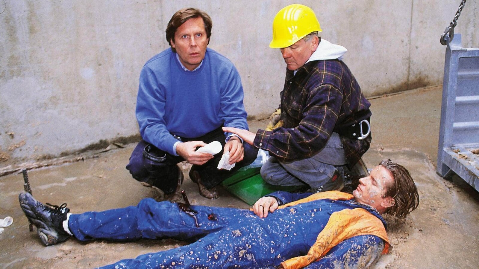Lebendig eingemauertKranführer Rainer Stoll (Philipp Moog, liegend) verunglückte auf der Baustelle. Dr. Stefan Frank (Sigmar Solbach, li.) versucht ihm zu helfen. Die Zeit drängt, denn der Beton wird rasend schnell hart ...Bild: © MG RTL / Elke Werner