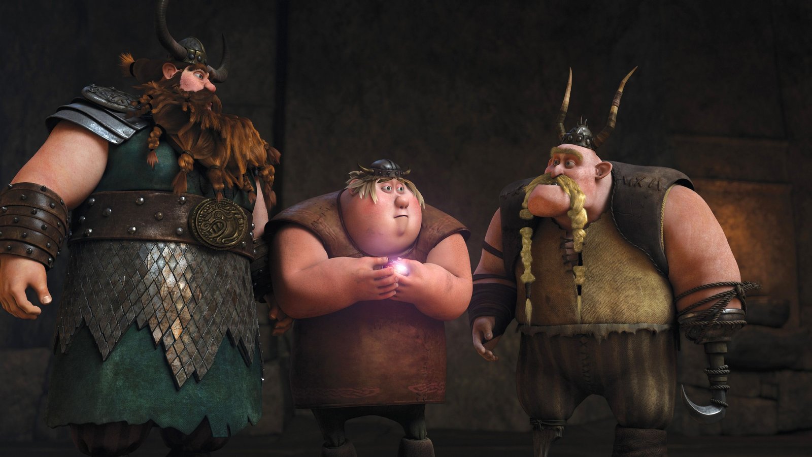 Fischbeins HerausforderungAls Fischbein (Mi.) einen leuchtenden Stein mit nach Berk bringt, sind alle aus dem Häuschen. Grobian (re.) weiß, was es mit dem seltsamen Ding auf sich hat.Bild: © Super RTL