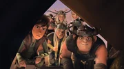 Familienbande (2)Hicks (vorne) und seine Freunde (v.li. Taffnuss, Raffnuss, Rotzbakke, Fischbein, Astrid und Haudrauf) wollen den Bösewichten Mehltau und Alvin das Handwerk legen.Bild: © DreamWorks Animation