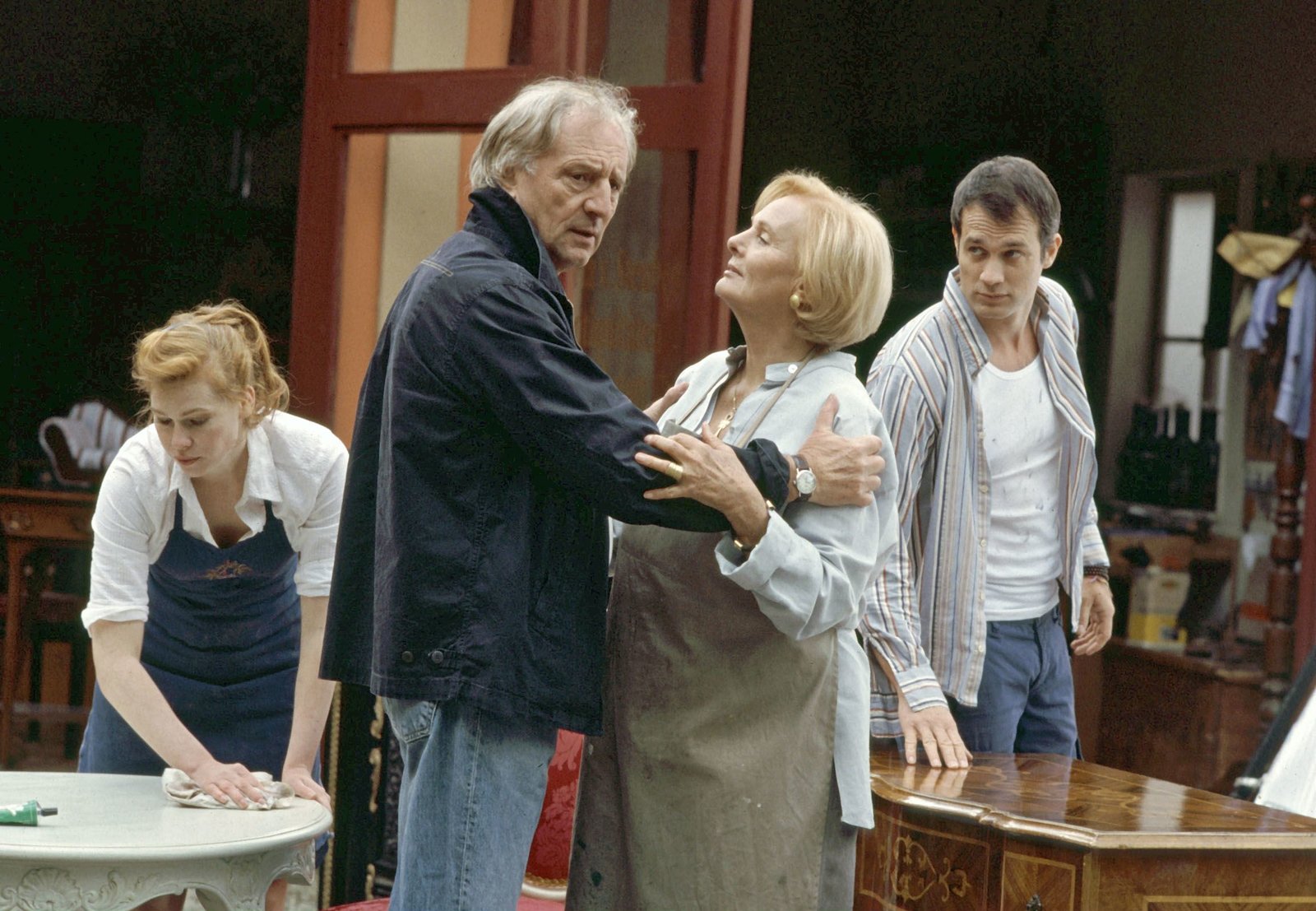 Drei teuflisch starke FrauenWDR Fernsehen DREI TEUFLISCH STARKE FRAUEN, Deutschland 2005, Regie Ariane Zeller, am Samstag (26.06.10) um 20:15 Uhr. Maria (Ruth Maria Kubitschek, 2.v.r.) poliert mit ihrer Haushälterin Veronika (Henny Reents, l.) und Hans Sommer (Günther Maria Halmer) alte Möbel auf, so dass sie wenigstens auf den ersten Blick wie sündhaft teure Antiquitäten aussehen. Mit diesen Möbeln soll ein hinterhältiger Immobilienhai aufs Kreuz gelegt werden, dem ihr unvorsichtiger Sohn Robert (Ralf Bauer, r.) nach einem geplatzten Geschäft eine Stange Geld schuldet.Bild: © WDR/Degeto/Marco O. Pichler