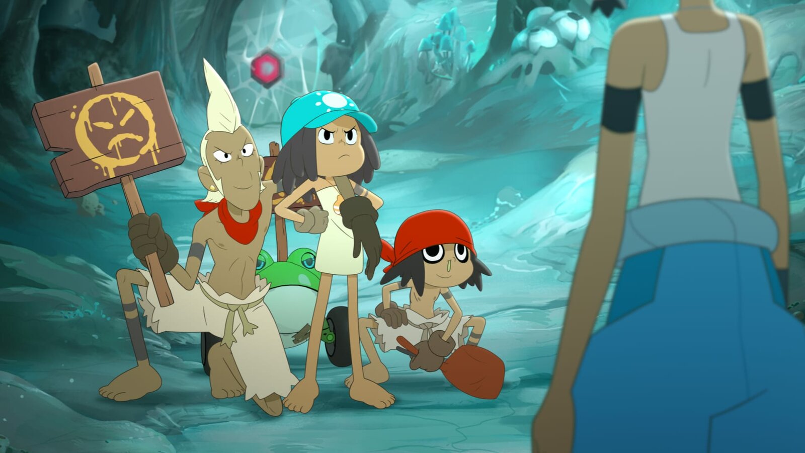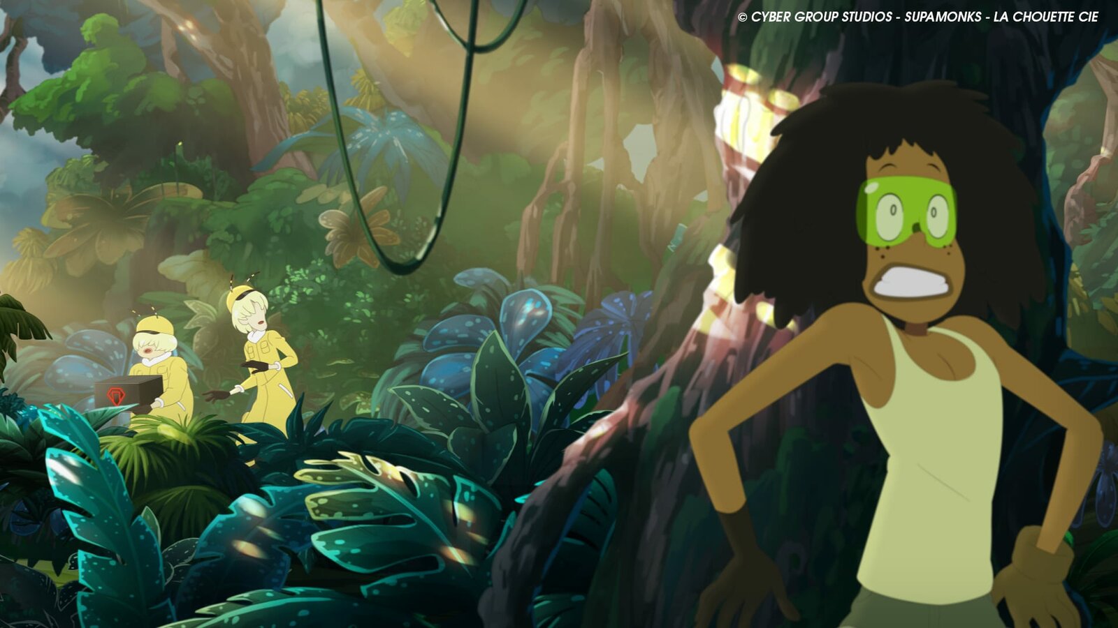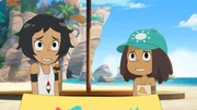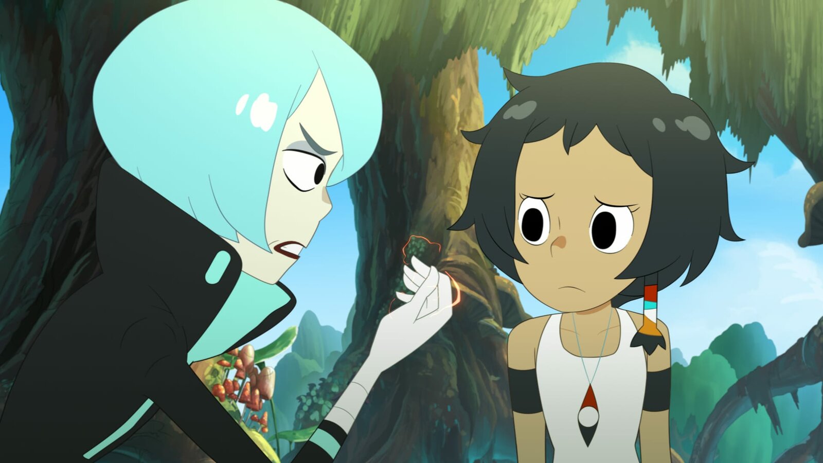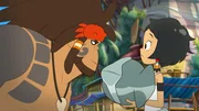 Der Smaragdwald-ParcoursCorto (r.) sucht Hilfe bei Genie Oro (l.): Soll sie eine Waffe benutzen, um sich gegen die unlauteren Methoden von Team Cold Kings zu wehren?Bild: © WDR/2021 Cyber Group Studios